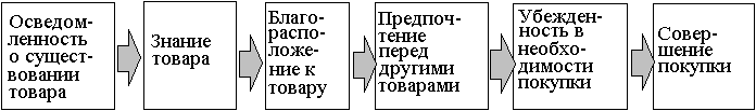 Целевая аудитория может находиться в любом из шести состояний покупательской готовности: осведомленность, знание, благорасположение, предпочтение, убежденность, совершение покупки.Ниже дается описание этих состояний.
