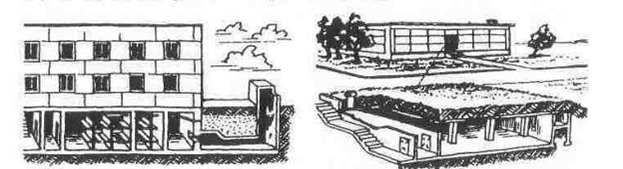 Встроенные – располагаются под зданиями наименьшей этажности на данной площади. Отдельно стоящие убежища строятся на открытой местности на незаваливаемой территории. Незаваливаемая территория определяется: высота здания, деленная на два, плюс три метра.