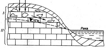 Рис.6.1. Зоны карстового массива в известняке: I - зона развития карста; II - зона цементации; УГВ – уровень грунтовых вод