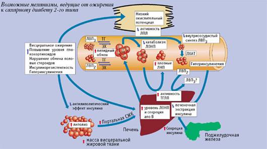 Рис. 17.1 Гипотетические механизмы, ведущие от висцерального ожирения к сахарному диабету 2 типа.Lemieux S, Despres JP. Diabete Metab 1994; 20: 375–393. ТГ — триглицериды, ЛОНП — липопротеины очень низкой плотности, ТГЛП — триглицеридлипаза печени, ЭХ — эфиры холестерина, ЛПЛ — липопротеинлипаза, ЛхАТ — лецитин-холестеринацилтрансфераза