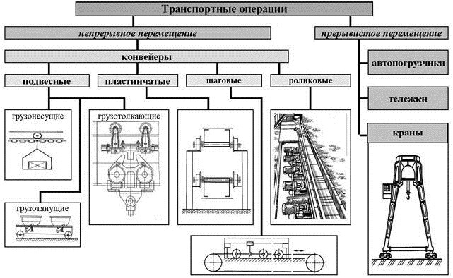 Прерывистое перемещение осуществляется универсальными средствами (электрокары, автопогрузчики, тележки, краны, электрические тельферы) и специальными устройствами (пульсирующие конвейеры, шаговые транспортеры, рольганги, склизы, толкатели). Выбор зависит от габаритов, веса изделия, частоты перемещений и планировки цеха. Краны (мостовые, козловые) незаменимы для тяжелых уникальных изделий, а тельферы – для локальных подъемов.