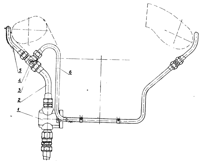 По трубке 2 топливо подается от помпы к тройнику 3, расположенному слева у задней части мотора. От тройника топливо по трубкам 5 и 6 подается к левому и правому карбюраторам. Кроме того, на тройнике имеется закрытый пробкой четвертый штуцер, который соединяется трубкой с топливным манометром.