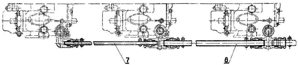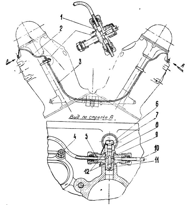 От тройника по наружной стороне обоих блоков проходят трубки 2 и 3, подводящие топливо к заливным жиклерам, ввинченным во впускные патрубки блоков, несущие карбюраторы. Заливные жиклеры между собою соединены трубками 4 и 10.