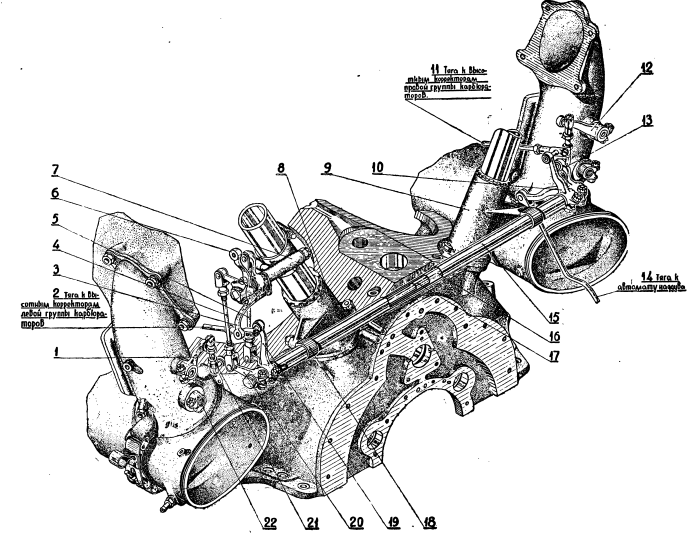 Наружная подвижная труба 16 с рычагами 19 и 10 обслуживает управление высотными корректорами. Ее левый рычаг одним плечом связан с рычагом 3 при помощи тяги 5, а второе плечо приводит в движение рычаги высотных корректоров левой группы карбюраторов тягой 2. Правый рычаг 10 тягой 11 управляет корректорами правой группы.