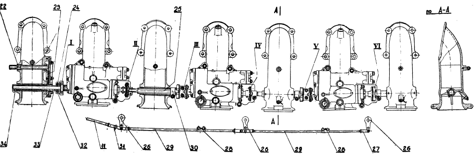 Внутренняя подвижная труба 17 обслуживает управление нормальным газом и наддувом. На ее левом конце закреплен рычаг 20, который приводится в движение тягой 4, а рычаг 20 при помощи тяги 21 передаст вращение на рычаг 1 задней левой воздушной трубы. Тяга 4 связана с рычагами вильчатыми шарнирами, тяга 21 — шаровыми.