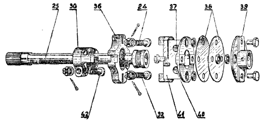 Правый терец корпуса микромуфты развит в круглый фланец. К нему двумя заклепками приклепаны два эластичные диска 38 из высокоуглеродистой стали толщиной 0,3 мм. Двумя другими заклепками эти диски приклепаны к ступице 39, посаженной на оси дроссельной заслонки карбюратора.
