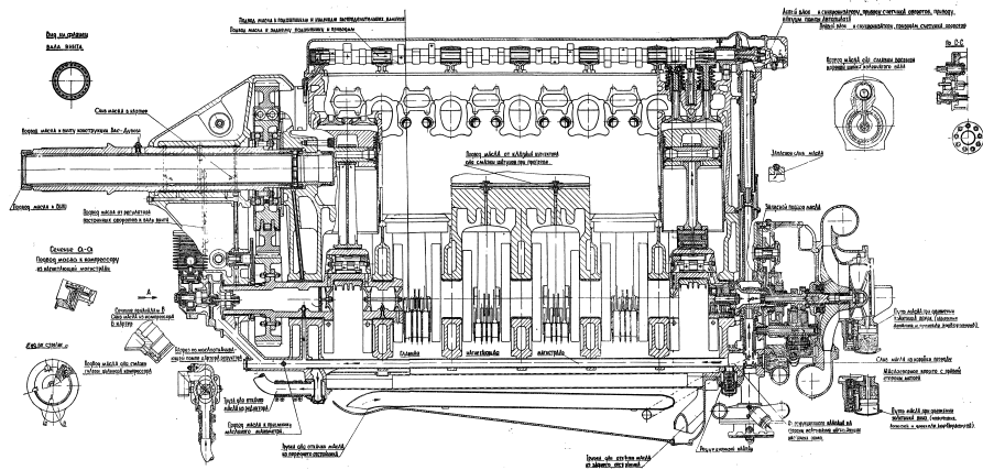 Подача смазки ко всем трущимся деталям и циркуляция масла в моторе обеспечивается организованной системой смазки (фиг. 69 и 70). В систему смазки входят: 1) две нагнетающие масляные помпы, 2) три откачивающие масляные помпы, 3) трубопроводы и каналы.