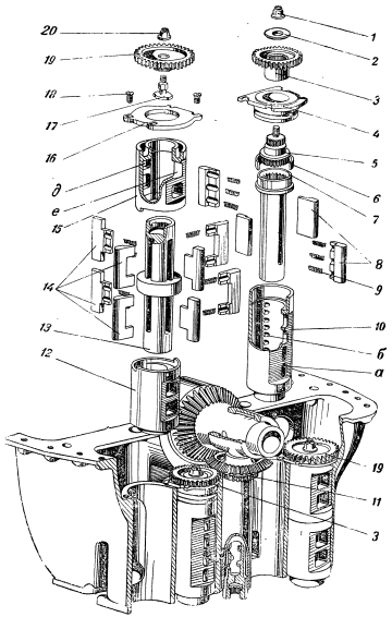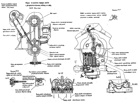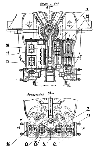 Шестерни привода обеих нагнетающих помп находятся в зацеплении с шестерней 11 привода всего узла помп. Направление вращения нагнетающих помп правое, а откачивающих — левое (если смотреть на помпы сверху).