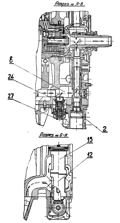 Регулирование редукционного клапана на требуемое давление в нагнетающей магистрали производится натяжением пружины клапана регулировочной пробкой. В нужном положении регулировочная пробка застопорена кольцевым замком. Редукционный клапан закрыт колпачком 27, ввинченным в корпус приводов. Для герметичности под буртик колпачка проложена прокладка.