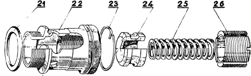 Редукционный клапан (фиг. 73) состоит из стального корпуса 22, поршенька 24, пружины 25, регулировочной пробки 26, замка 23 и прокладки 21.