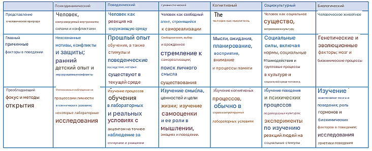 Таблица 1.1. Сравнение шести основных точек зрения на поведение человека