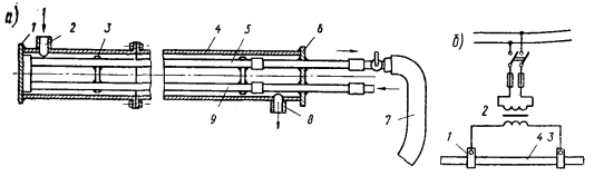 Для отогревания замерзшего конденсата в трубопроводах подвижного состава пользуются установкой, показанной на рис. VII.13, б. Эта установка состоит из понизительного трансформатора 2 220/36 в, вторичная обмотка которого присоединяется к клеммам 1 хомутов 3, закрепленных на замерзшем участке трубопровода 4 подвижного состава. Для уменьшения переходного сопротивления места, на которых закрепляются хомуты 3, должны быть зачищены до металлического блеска. Для разогревания замерзшего конденсата в течение 10 мин ток в трубопроводе должен быть около 300 а.