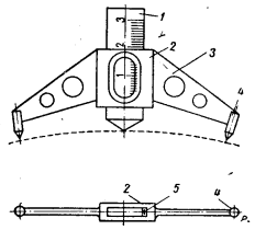 Для измерения глубины лыски лыскомер устанавливают на поверхности катания бандажа, свободной от лыски, в плоскости круга катания колеса, проходящей через продольную ось лыски. Линейка 1 остриями ножек 4 упирается в бандаж, замер берется по нониусу с точностью 0,01 мм. Затем лыскомер устанавливают на бандаже в плоскости круга катания колеса так, чтобы центр линейки 1 находился над центром лыски. Линейку опускают до соприкосновения с бандажом и делают второй замер. Глубину лыски определяют как разность замеров. Предельная ошибка замеров при этом будет 0,02 мм.