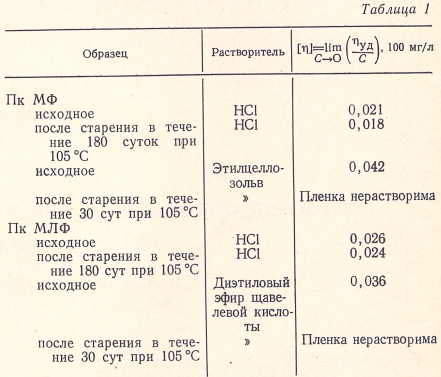 Как видно из табл. 1, изменение вязкости в данном случае не может характеризовать процесс старения. Растворимость Пк в органических растворителях с течением времени резко снижается. Применение же в качестве растворителя минеральных кислот не дает приемлемых результатов, поскольку вязкость растворов не зависит от времени старения образца: она почти не изменяется.