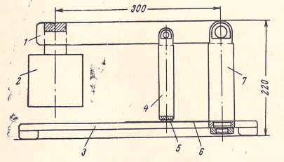 При установке более высокой нагрузки используют специальное приспособление (см. рисунок). Приспособление представляет собой рычажную систему, которая через резиновый диск 5, прикрепленный к торцу стержня 4 диаметром 25 мм, передает необходимую нагрузку на бумажный диск, лежащий на образце 6. Стержень свободно вращается в вертикальной плоскости на рычаге 1; последний в свою очередь шарнирно крепится к стойке 7 диаметром 45 мм, неподвижно укрепленной на плите 3. Стержень поднимают за рычаг 1 и под него подкладывают обращенный образец 6. На образен кладут бумажный диск и стержень опускают вниз. Время воздействия нагрузки на Пк 60±2 с. В описываемом случае нагрузка составляет 2 кгс и создается массами рычага и стержня.