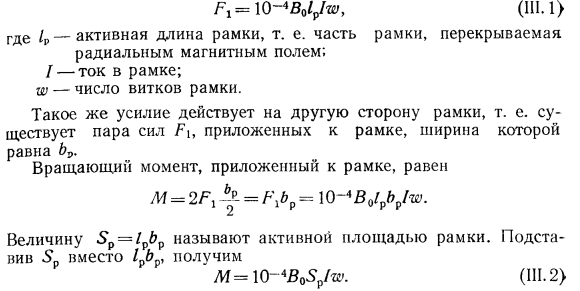 Вращающему моменту, развиваемому рамкой, противодействует развиваемый волосками момент M1 = ca, где а—угол поворота подвижной системы и с — коэффициент упругости токопроводов.