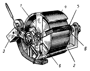 Фиг. 16. Схема гальванометра с внутрирайонным магнитом. 1 - магнит, 2 - железное кольцо; 3 - арматура; 4 - внешний магнитопровод; 5 - подвижная рамка; 6 - токоподводы