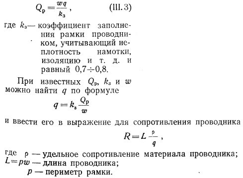 При площади Qp поперечного сечения рамки в границах этой площади можно намотать тем больше витков ω, чем меньше их сечение q. Таким образом, для увеличения вращающего момента М следует стремиться к уменьшению q. Площадь поперечного сечения рамки QP можно выразить уравнением