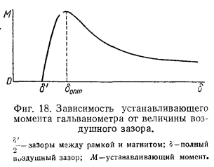 Если все же величина вращающего момента окажется недостаточной, то дальнейшее ее увеличение достигается выбором оптимальной величины зазора магнитной системы. Если толщина поперечного сечения рамки h, а длина d (фиг. 17), то