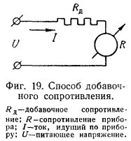 1. Способ добавочного сопротивления. Последовательно с гальванометром включают добавочное сопротивление Rд (фиг. 19), изготовленное из проволоки с очень малым температурным коэффициентом (никелин, константан и т. д.). Такое сопротивление можно считать не зависящим от температуры. Ток в приборе в этом случае равен