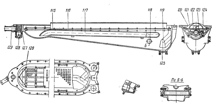 Внутри корыта расположены две дуралюминовые трубки 117 и 119 диаметром 34 х 32 мм для откачивания масла из переднего и заднего маслоотстойников. Задние концы этих трубок развальцованы в теле маслосборного корыта. Трубка, по которой откачивается масло из переднего маслоотстойника, кроме развальцовки заднего конца, крепится на двух подвесках 121 и хомутах 122 винтами 123 и 124 к четырем бобышкам маслосборного корыта. Эта трубка посредством канала в маслосборном корыте и канала в картере соединена с заборной полостью левой откачивающей помпы.