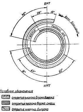 Для наглядного представления процесса газораспределения на фиг. 16 приведена диаграмма фаз газораспределения, показывающая перекрытие клапанов по углу поворота коленчатого вала.