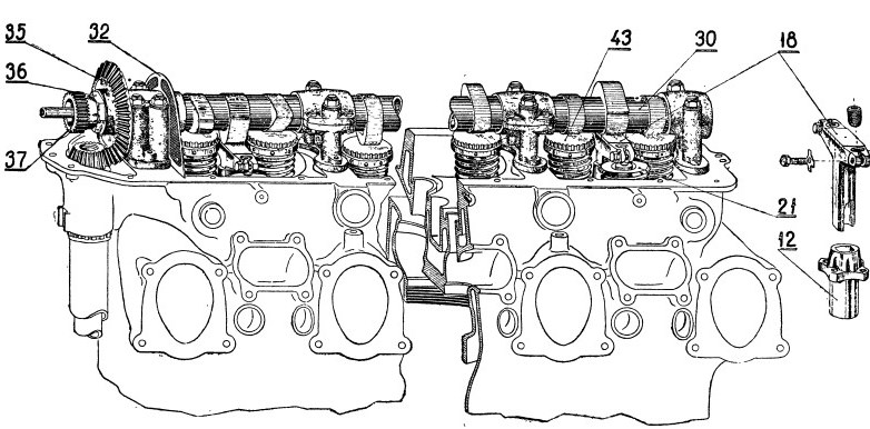 Механизм распределения. Механизм распределения (фиг. 13 и 14) расположен в верхней части блоков и состоит из распределительных валиков 30, по одному на каждый блок, вращающихся в семи подшипниках (передний и задний подшипники неразъемные, а все промежуточные — разъемные); клапанов впуска 43; клапанов выпуска 21; пружин цилиндрических — наружных 16, внутренних 17 и траверс 18, передающих движение выхлопным клапанам.