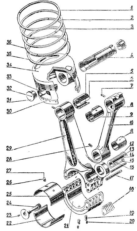 Мотор имеет шесть главных и шесть прицепных шатунов, изготовленных из высококачественной стали 18ХНВА.