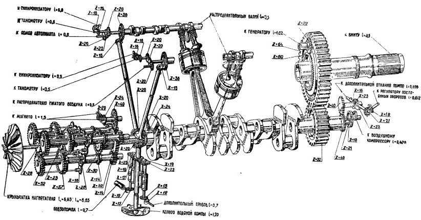 Наклонные валики передают вращение распределительным валикам. От левого распределительного валика осуществлены передачи к синхронизатору, тахометру и помпе автопилота; от правого — к синхронизатору, тахометру и распределителю сжатого воздуха.