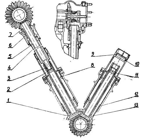 Нижние наклонные валики вращаются в подшипниках 13, устанавливаемых в гнездах верхнего картера. Подшипники представляют собой алюминиевые стаканы, на посадочные места которых напрессованы стальные бандажи 12. Смещение бандажей предупреждается стопором 8. На рабочих поверхностях подшипников имеются канавки и отверстия для прохода масла. Масло, стекая из-под крышек блоков, попадает в канавки и отверстия в подшипниках и смазывает шейки и торцы шестерен нижних наклонных валиков. Правый и левый подшипники отличаются своей длиной: длина подшипника правого валика 179 мм, а левого —170,5 мм: