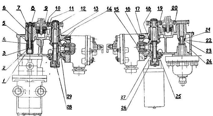 Передача вращения валику синхронизатора 15 осуществляется парой цилиндрических и парой конических шестерен. Цилиндрическая шестерня 11, посаженная на двух шпонках Вудруфа и закрепленная гайкой 12 на хвостовике ведущей шестерни 13 валика синхронизатора, получает вращение от цилиндрической шестерни распределительного валика. Ведущая шестерня 13 в свою очередь передает вращение сцепленной с ней конической шестеренке 29.