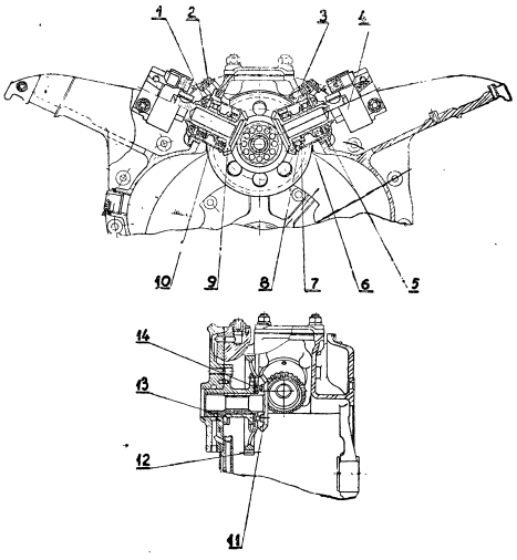Вращение шестерен привода магнето осуществляется от ведущей шестерни нагнетателя, посаженной на хвостовике задней шестерни коленчатого вала. Ведущая шестерня нагнетателя сцепляется с цилиндрической шестерней 12, которая соединена заклепками 14 с конической ведущей шестерней привода магнето 11, смонтированной в алюминиевом подшипнике 13, закрепленном в задней стенке верхнего картера.