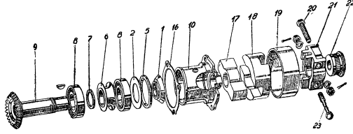 Вращение ведущей шестерни привода магнето передается ведомым валикам, изготовленным за одно целое с коническими шестернями 9 привода правого и левого магнето.