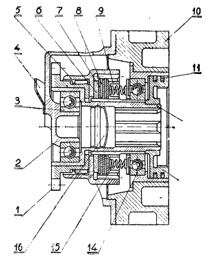 Диски прижаты друг к другу опорной шайбой 6 и пружинами 15, поставленными по окружности в обойме 9. Внутренние шлицы муфты 12 служат для соединения с хвостовиком вала генератора. Муфта валика генератора монтируется в корпусе 2 и крышке 10 на двух шариковых подшипниках 3 и 14. Для смазки привода на переднем торце крышки установлен маслоулавливатель 4. Уплотнение от попадания масла в генератор осуществляется двумя уплотнительными кольцами 11, установленными в обойме 13, посаженной на муфту валика генератора. Пустотелая часть муфты валика генератора закрыта заглушкой 16.