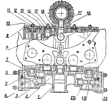 Привод помп осуществляется от задней шестерни коленчатого вала 17 посредством цилиндрической шестерни валика привода 18 водяной помпы и цилиндрических шестерен 9 и 13, соединенных с валиками нагнетающих и откачивающих помп. Валик нагнетающей помпы 8 в верхней части имеет шлицы, которыми он соединяется с валиком привода помпы 14. На шлицах верхнего конца валика привода посажена шестерня 13, закрепленная на нем гайкой 15, законтренной шплинтом. Вращается шестерня в алюминиевом подшипнике, закрепленном в картере винтами.