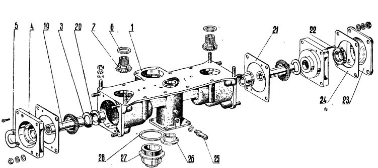 В передней части снизу в коробку устанавливается редукционный клапан масломагистрали, закрытый колпаком 27 с прокладкой 28.
