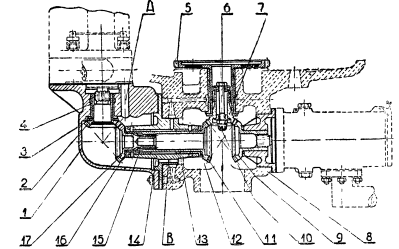 Стык каналов корпуса привода и верхнего картера уплотнен переходными втулками и резиновыми кольцами. Масло из регулятора оборотов сливается в картер через отверстие А в корпус привода и через отверстия В в подшипнике.