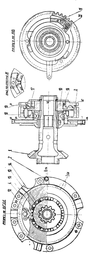 На сепаратор и ролики свободно установлена большая шестерня управления 16, имеющая упоры б на торце, обращенном к ведущей шестерне нагнетателя, которая также имеет упор г. Большая шестерня управления имеет возможность свободно поворачиваться в ту или другую сторону относительно ведущей шестерни нагнетателя в пределах угла, ограниченного этими упорами. Число зубьев большой шестерни управления такое же, как и у ведущей шестерни нагнетателя.