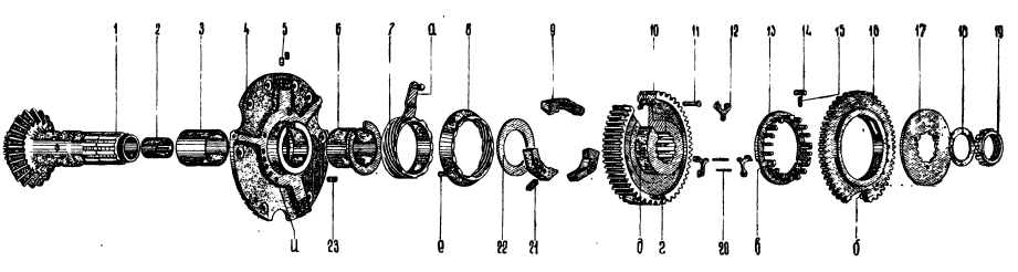 Наружный рычаг переключения скоростей поворачивает на определенный угол сектор 7 относительно ступицы подшипника-фланца.