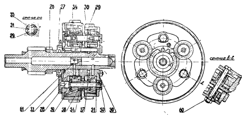 Втулки сочленены с малым зазором по лыскам и с большим зазором по цилиндрической части. Сквозь втулки проходит ведущий штифт 29. С обоих концов ведущего штифта ввинчены винты 45, связывающие штифт с передним и задним дисками и стопорящиеся шайбами 44.