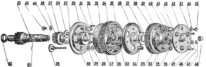 Внутри промежуточного валика запрессована втулка 61, распределяющая масло для смазки фрикционов и заднего подшипника валика.