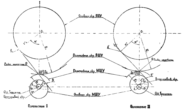 Центр О3 основной окружности МШУ (фиг. 47) эксцентричен оси вращения и вращается вокруг оси вращения МШУ О2, поэтому расстояние между центрами основных окружностей МШУ и БШУ при вращении шестерен не постоянно, а меняется на двойную величину эксцентриситета. Полюс зацепления р шестерен находится на пересечении линии центров вращения О1-О2 с касательной АБ к основным окружностям шестерен и вследствие эксцентричности одной окружности несколько перемещается по линии центров, занимая за один оборот МШУ последовательно все положения Рх; тем самым периодически изменяется отношение радиусов делительных окружностей или передаточное отношение i = R1/R2, вследствие чего шестерни имеют периодически меняющееся неравномерное вращение.