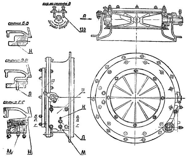 Внутренняя часть корпуса расточена по сфере и имеет 12 радиальных отверстий с втулками 126 для установки лопаток 128. Лопатки своими шейками вставляются изнутри корпуса во втулки и покоятся на стальных иголках 127. С наружной стороны на шейке устанавливается прокладка 125 и зубчатый сектор 123, который укрепляется на шейках штифтами 124.