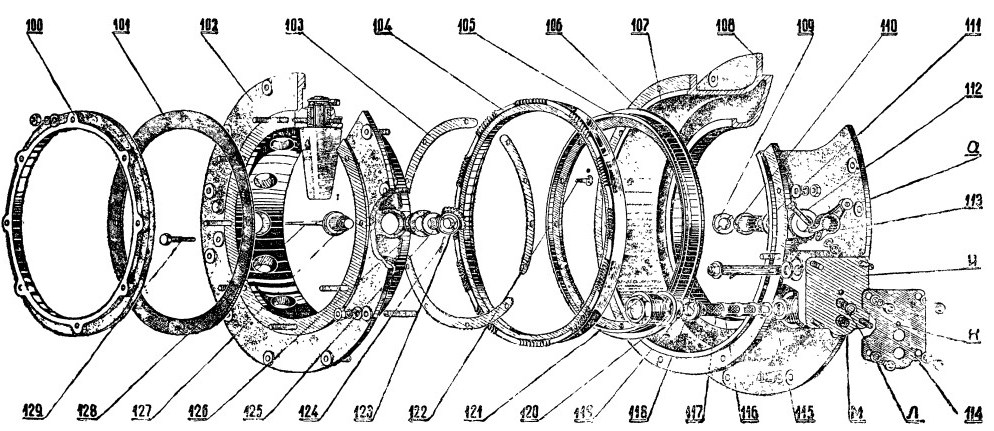 Зубчатые секторы всех 12-ти лопаток устанавливаются синхронно и сцепляются с конической шестерней 104, которая вращается на двух рядах стальных шариков 106 и 107. Стальные шарики помещены в двух канавках упорного кольца 105 и воспринимают радиальные и осевые давления шестерни. Упорное кольцо надевается на цилиндрическую часть корпуса и крепится к корпусу винтами 122.