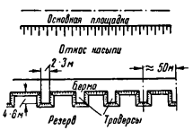 Путевой откос резерва в плане должен иметь ряд выступов — траверс (фиг. 49) шириной 2/3 м и длиной не более половины ширины резерва по верху. Расстояние между осями траверс принимается равным двойной длине траверсы.