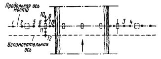 Фиг. 53а. Закрепление оси моста парными столбами: 1, 2, 3, 4 — створные столбы; 5-6, 7-8, 9-10, 11-12 — парные столбы по осям опор