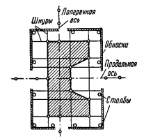 Детальная разбивка опор в процессе их сооружения заключается в откладывании взятых с рабочего чертежа расстояний от основных осей и закреплении их на обносках из досок, горизонтально пришитых к столбам или свайкам, установленным вокруг сооружаемой опоры. Положения боковых граней опоры закрепляются на досках-обносках при помощи гвоздей или зарубок, по которым в процессе работ натягиваются шнуры (фиг. 53 б).
