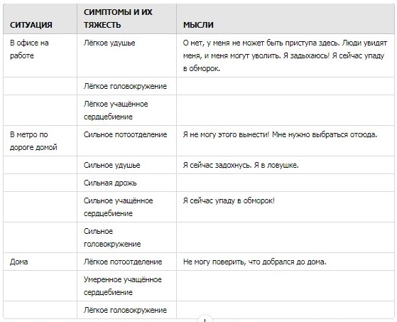 Когнитивно-поведенческие вмешательства включают несколько компонентов (Craske & Barlow, 2014). Во-первых, пациентов обучают техникам релаксации и дыхательным упражнениям, которые помогают обрести некоторый контроль над симптомами и позволяют участвовать в других этапах терапии. Во-вторых, терапевт помогает пациентам выявить катастрофизирующие мысли, связанные с изменениями телесных ощущений. Пациенты могут вести дневники своих мыслей о телесных ощущениях в промежутках между сессиями, особенно в моменты, когда они начинают чувствовать приближение паники. Например, на рисунке 6 показан дневник одного пациента, который отмечал легкие симптомы паники на работе, но более выраженные — в метро по пути домой. В обеих ситуациях его преследовали мысли о чувстве удушья, ловушки и обморока.