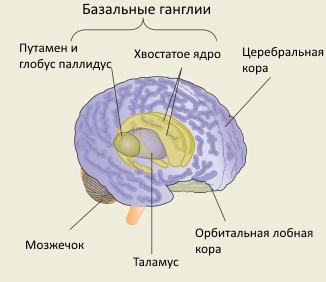 Биологические теории. Биологические теории обсессивно-компульсивного расстройства (ОКР) сосредоточены на нейронной цепи в мозге, которая участвует в регуляции моторного поведения, когнитивных процессов и эмоций (Milad & Rauch, 2012). Эта цепь проходит от определенных областей фронтальной коры к базальным ганглиям (в частности, к стриатуму), затем через базальные ганглии к таламусу и возвращается обратно к фронтальной коре (Рисунок 8). У людей с ОКР, трихотилломанией (расстройством выдергивания волос) и дерматилломанией (расстройством выщипывания кожи) наблюдаются изменения в структуре и активности этих областей, а также в связях между ними (Milad & Rauch, 2012). У людей с патологическим накопительством отмечаются изменения в других областях фронтальной коры и лимбической системы (Saxena, 2008). У людей с дисморфофобией активность мозга отличается от здоровых людей при обработке визуальных стимулов, включая лица (Fang & Wilhelm, 2015).