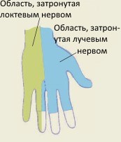 Рис. 1. Перчаточная анестезия. При конверсионном симптоме, называемом перчаточной анестезией, онемевает вся рука от кончиков пальцев до запястья. Фактическое физическое повреждение локтевого нерва, напротив, вызывает анестезию в безымянном пальце и мизинце, а также за запястьем на всем протяжении руки; повреждение лучевого нерва вызывает анестезию только в части безымянного, среднего и указательного пальцев и большого пальца, а также на всем протяжении руки